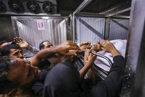 (250604) -- GAZA, 4 junio, 2025 (Xinhua) -- Palestinos se lamentan por una víctima asesinada en un ataque aéreo israelí, en el Hospital Al-Shifa, en la Ciudad de Gaza, el 4 de junio de 2025. Al menos 54.510 personas han sido asesinadas y 124.901 han resultado heridas en Gaza durante la campaña militar israelí, según las autoridades de salud en el territorio. (Xinhua/Mahmoud Zaki) (ra) (vf)