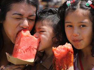 (250608) -- LOS ANGELES, 8 junio, 2025 (Xinhua) -- Imagen del 7 de junio de 2025 de personas posando para una fotografía con sandías durante el Festival de la Sandía de California 2025 en el Parque de la Presa Hansen, en Los Angeles, California, Estados Unidos. (Xinhua/Qiu Chen) (rtg) (da)
