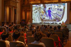 (250606) -- BUDAPEST, 6 junio, 2025 (Xinhua) -- Personas asisten a una sesión especial de preguntas y respuestas sobre ciencia espacial con astronautas chinos a bordo de la estación espacial Tiangong, en Budapest, Hungría, el 6 de junio de 2025. Más de 300 estudiantes, científicos y funcionarios gubernamentales se reunieron el viernes en la Academia Húngara de Ciencias para asistir a una sesión especial de preguntas y respuestas sobre ciencia espacial con astronautas chinos a bordo de la estación espacial Tiangong. (Xinhua/Chen Hao) (jg) (da) (ce)
