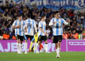 (250611) -- BUENOS AIRES, 11 junio, 2025 (Xinhua) -- Imagen del 10 de junio de 2025 del jugador, Thiago Almada (d), de Argentina, festejando después de anotar durante el partido ante Colombia correspondiente a las Eliminatorias Sudamericanas para el Mundial de Estados Unidos, México y Canadá 2026, celebrado en el Estadio Monumental, en la ciudad de Buenos Aires, capital de Argentina. (Xinhua/Martín Zabala) (ra) (ce)