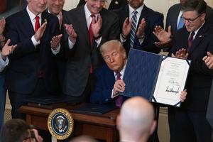 (250612) -- WASHINGTON, 12 junio, 2025 (Xinhua) -- El presidente de Estados Unidos, Donald Trump, muestra un proyecto de ley firmado durante una ceremonia de firma en la Casa Blanca, en Washington, D.C., Estados Unidos, el 12 de junio de 2025. El jueves, en una ceremonia de firma en la Casa Blanca, Trump eliminó los estándares de emisiones de vehículos de California, líderes en el país, revocando las estrictas normas que se habían convertido en un modelo para que los estados de todo el país hicieran realidad sus objetivos en materia de gases de efecto invernadero. (Xinhua/Hu Yousong) (jg) (da) (ce)