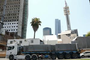 (250614) -- TEL AVIV, 14 junio, 2025 (Xinhua) -- Imagen del 13 de junio de 2025 de un camión transportando muros para búnker en una calle, en Tel Aviv, Israel. Las Fuerzas de Defensa de Israel (FDI) confirmaron a primera hora del viernes en un comunicado que habían lanzado un ataque "preventivo, preciso y combinado" contra docenas de objetivos militares, incluyendo objetivos nucleares en diferentes zonas de Irán, añadiendo que "Irán está más cerca que nunca de obtener un arma nuclear". Tras el ataque, el Comando del Frente Interno de las FDI prohibió las actividades educativas y las reuniones en Israel, excepto en los sectores esenciales. (Xinhua/Gideon Markowicz/JINI) (oa) (da)