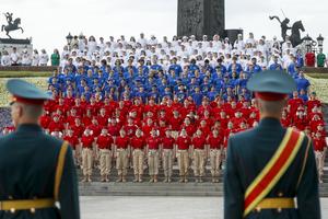 (250613) — MOSCU, 13 junio, 2025 (Xinhua) — Imagen del 12 de junio de 2025 de jóvenes rusos, vestidos con los colores de la bandera nacional rusa, asistiendo a una ceremonia de izamiento de la bandera nacional para celebrar el Día de Rusia en el Parque de la Victoria, en Moscú, Rusia. El Día de Rusia conmemora la fecha en que el Primer Congreso de Diputados del Pueblo de la Federación Rusa adoptó la Declaración de Soberanía Nacional de Rusia en 1990. (Xinhua/Alexander Zemlianichenko Jr) (jg) (da) (vf)
