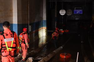 (250620) -- LONGSHAN, 20 junio, 2025 (Xinhua) -- Bomberos drenan el agua en un garaje subterráneo de un complejo residencial, en el distrito de Longshan, en la provincia de Hunan, en el centro de China, el 20 de junio de 2025. Las lluvias torrenciales han causado graves inundaciones urbanas en el distrito de Longshan, en la provincia central china de Hunan. (Xinhua/Chen Zhenhai) (oa) (ra) (ce)
