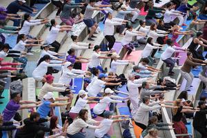 (250621) -- BOGOTÁ, 21 junio, 2025 (Xinhua) -- Personas participan en una sesión de yoga durante la celebración del Día Internacional del Yoga en la Plaza Cultural La Santamaría, en Bogotá, Colombia, el 21 de junio de 2025. Miles de colombianos celebraron el sábado el Día Internacional del Yoga en la capital colombiana, como parte de un programa de la alcaldía de la ciudad que busca resignificar los espacios urbanos, al tiempo que incentiva las prácticas saludables entre la población. (Xinhua/Andrés Moreno) (am) (jg) (da)