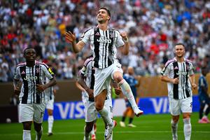 (250623) -- FILADELFIA, 23 junio, 2025 (Xinhua) -- Imagen del 22 de junio de 2025 de Dusan Vlahovic (frente), de Juventus, festejando una anotación durante el partido del grupo G entre Juventus de Italia y Wydad AC de Marruecos en la Copa Mundial de Clubes de la FIFA 2025, en Filadelfia, Estados Unidos. (Xinhua/Wu Xiaoling) (oa) (rtg) (vf)