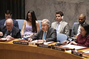 (250623) -- NACIONES UNIDAS, 23 junio, 2025 (Xinhua) -- Imagen del 22 de junio de 2025 del secretario general de la ONU, António Guterres (c-frente), hablando en una reunión de emergencia del Consejo de Seguridad de la ONU, en la sede de la ONU, en Nueva York. Guterres advirtió el domingo sobre un "ciclo de represalias" tras los ataques estadounidenses contra instalaciones nucleares iraníes. (Xinhua/Xie E) (rtg) (oa) (ce)