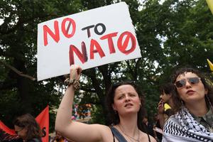 (250623) -- LA HAYA, 23 junio, 2025 (Xinhua) -- Imagen del 22 de junio de 2025 de una manifestante sosteniendo una pancarta, en La Haya, Países Bajos. La manifestación, a la que asistieron cientos de personas, tuvo lugar dos días antes de la cumbre de la OTAN, en la que se espera que los Estados miembros presionen para aumentar el gasto en defensa. (Xinhua/Zhao Dingzhe) (oa) (rtg) (ce)