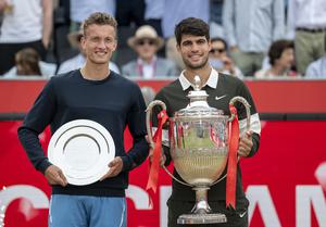 (250623) -- LONDRES, 23 junio 2025 (Xinhua) -- Imagen del 22 de junio de 2025 del ganador, Carlos Alcaraz, y el subcampeón, Jiri Lehecka, posando durante la ceremonia de premiación de la final de individuales masculinos entre Carlos Alcaraz, de España, y Jiri Lehecka, de la República Checa, en el Torneo de Queen's Club, en Londres, Reino Unido. (Xinhua/Stephen Chung) (oa) (rtg) (ce)