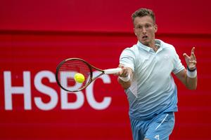 (250623) -- LONDRES, 23 junio 2025 (Xinhua) -- Imagen del 22 de junio de 2025 de Jiri Lehecka devolviendo la pelota durante la final de individuales masculinos entre Carlos Alcaraz, de España, y Jiri Lehecka, de la República Checa, en el Torneo de Queen's Club, en Londres, Reino Unido. (Xinhua/Stephen Chung) (oa) (rtg) (ce)
