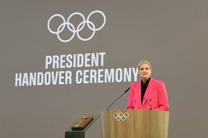 (250623) -- LAUSANA, 23 junio, 2025 (Xinhua) -- La presidenta del COI, Kirsty Coventry, habla durante una ceremonia de entrega de la Presidencia, en la Casa Olímpica, en Lausana, Suiza, el 23 de junio de 2025. (Xinhua/Lian Yi) (rtg) (oa) (vf)