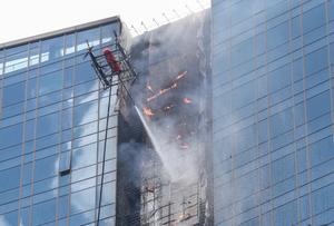 (250625) -- SHENZHEN, 25 junio, 2025 (Xinhua) -- Imagen del 24 de junio de 2025 de un dron liberando un agente extintor de incendios durante un simulacro de incendio para un edificio de gran altura, en Shenzhen, en la provincia de Guangdong, en el sur de China. El martes se llevó a cabo aquí un simulacro de incendio para un edificio de gran altura con el objetivo de probar la eficacia de los métodos de extinción de incendios de alta tecnología y mejorar el tiempo de respuesta. (Xinhua/Mao Siqian) (ra) (vf)