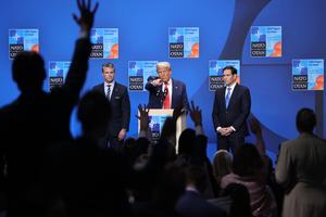 (250625) -- LA HAYA, 25 junio, 2025 (Xinhua) -- El presidente de Estados Unidos, Donald Trump (c), asiste a una conferencia de prensa tras la cumbre de la OTAN, en La Haya, Países Bajos, el 25 de junio de 2025. Trump señaló el miércoles que su país sostendrá conversaciones con Irán la próxima semana. (Xinhua/Zhao Dingzhe) (jg) (da) (vf)