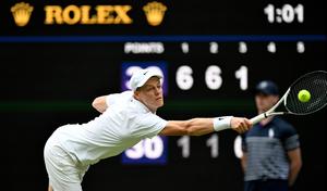 (250704) -- LONDRES, 4 julio, 2025 (Xinhua) -- Imagen del 3 de julio de 2025 de Jannik Sinner devolviendo la pelota durante el partido de segunda ronda de individuales masculinos entre Jannik Sinner, de Italia, y Aleksandar Vukic, de Australia, en el Campeonato de Tenis de Wimbledon, en Londres, Reino Unido. (Xinhua/Li Ying) (rtg) (ra) (vf)