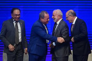 (250705) -- RIO DE JANEIRO , 5 julio, 2025 (Xinhua) -- (De izq. a der.) El primer ministro de Malasia, Anwar Ibrahim, el presidente de la Confederación Nacional de la Industria, Ricardo Alban, el presidente brasileño, Luiz Inácio Lula da Silva, y el vicepresidente brasileño, Geraldo Alckmin, asisten a la apertura del Foro Empresarial de los BRICS, en Río de Janeiro, Brasil, el 5 de julio de 2025. Lula da Silva destacó el sábado, en la apertura del Foro Empresarial de los BRICS, en Río de Janeiro, la importancia de la colaboración económica entre los países del bloque, y defendió el multilateralismo ante el surgimiento de tendencias proteccionistas. (Xinhua/Lucio Tavora) (lt) (rtg) (da)