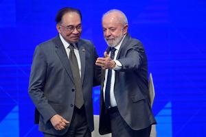 (250705) -- RIO DE JANEIRO , 5 julio, 2025 (Xinhua) -- El presidente brasileño, Luiz Inácio Lula da Silva (d), y el primer ministro de Malasia, Anwar Ibrahim (i), reaccionan durante la apertura del Foro Empresarial de los BRICS, en Río de Janeiro, Brasil, el 5 de julio de 2025. Lula da Silva destacó el sábado, en la apertura del Foro Empresarial de los BRICS, en Río de Janeiro, la importancia de la colaboración económica entre los países del bloque, y defendió el multilateralismo ante el surgimiento de tendencias proteccionistas. (Xinhua/Lucio Tavora) (lt) (rtg) (da)