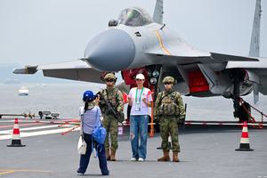 (250705) -- HONG KONG, 5 julio, 2025 (Xinhua) -- Una visitante posa para una fotografía en el portaaviones Shandong, en Hong Kong, en el sur de China, el 5 de julio de 2025. Hong Kong celebró el 28 aniversario de su retorno a la patria con una significativa visita de una flota de la Armada del Ejército Popular de Liberación de China, encabezada por el primer portaaviones de fabricación nacional de China, el Shandong. Desde noviembre de 2024, la Armada del Ejército Popular de Liberación de China ha realizado tres visitas a Hong Kong, desplegando una amplia gama de buques, incluidos portaaviones, buques de asalto anfibio y destructores de misiles. El portaaviones Shandong fue abierto a las visitas públicas durante este viaje. (Xinhua/Zhu Wei) (oa) (da)