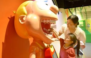 (250705) -- BEIJING, 5 julio, 2025 (Xinhua) -- Una niña aprende a cepillarse los dientes por medio de un modelo bucal humano en un museo de ciencia y tecnología, en la ciudad de Zaozhuang, en la provincia de Shandong, en el este de China, el 5 de julio de 2025. (Xinhua/Liu Mingxiang) (jg) (da)