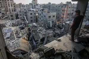 (250705) -- GAZA, 5 julio, 2025 (Xinhua) -- Imagen del 4 de julio de 2025 de un palestino inspeccionando viviendas destruidas tras un ataque aéreo israelí en el campamento de refugiados de al-Shati, en el oeste de la Ciudad de Gaza. (Xinhua/Rizek Abdeljawad) (jg) (rtg) (da)