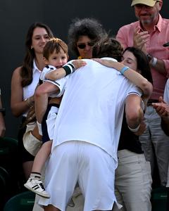 (250705) -- LONDRES, 5 julio, 2025 (Xinhua) -- Imagen del 4 de julio de 2025 de Nicolás Jarry (c) festejando con su familia tras ganar el partido de tercera ronda de individuales masculinos entre Nicolás Jarry, de Chile, y Joao Fonseca, de Brasil, en el Campeonato de Tenis de Wimbledon, en Londres, Reino Unido. (Xinhua/Li Ying) (oa) (da)