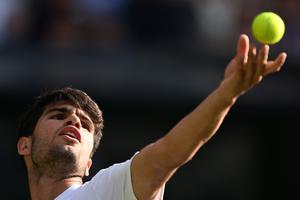(250705) -- LONDRES, 5 julio, 2025 (Xinhua) -- Imagen del 4 de julio de 2025 de Carlos Alcaraz sirviendo la pelota durante el partido de tercera ronda de individuales masculinos entre Carlos Alcaraz, de España, y Jan-Lennard Struff, de Alemania, en el Campeonato de Tenis de Wimbledon, en Londres, Reino Unido. (Xinhua/Zhao Dingzhe) (oa) (da)