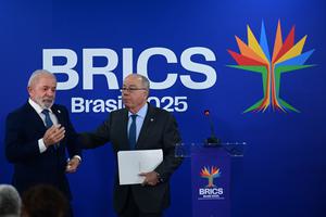 (250707) -- RIO DE JANEIRO, 7 julio, 2025 (Xinhua) -- El presidente brasileño, Luiz Inácio Lula da Silva (i), y el ministro de Relaciones Exteriores brasileño, Mauro Vieira (d), asisten a una conferencia de prensa durante la XVII Cumbre del BRICS, en el Museo de Arte Moderno, en Río de Janeiro, Brasil, el 7 de julio de 2025. Lula da Silva criticó el lunes las amenazas del presidente estadounidense, Donald Trump, de aumentar en 10 por ciento los aranceles a los países que se adhieran al grupo BRICS, y calificó la postura como "equivocada e irresponsable". (Xinhua/Lucio Tavora) (lt) (rtg) (ah) (ce)