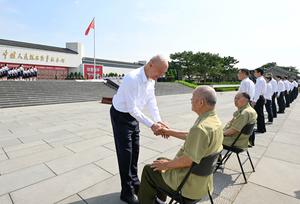 (250707) -- BEIJING, 7 julio, 2025 (Xinhua) -- Cai Qi, miembro del Comité Permanente del Buró Político del Comité Central del Partido Comunista de China (PCCh) y miembro del Secretariado del Comité Central del PCCh, estrecha la mano de veteranos de la guerra de resistencia contra la agresión japonesa, en Beijing, capital de China, el 7 de julio de 2025. China celebró el lunes una ceremonia para conmemorar el 88º aniversario del inicio de la resistencia de toda la nación contra la agresión japonesa. Igualmente, se inauguró una exposición con el tema "Por la liberación nacional y la paz mundial", en el Museo de la Guerra de Resistencia del Pueblo Chino contra la Agresión Japonesa. Cai Qi pronunció un discurso en el evento y anunció la inauguración de la exposición. (Xinhua/Shen Hong) (rtg) (ah) (ce)