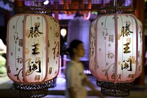 (250708) -- NANCHANG, 8 julio, 2025 (Xinhua) -- Imagen del 7 de julio de 2025 de una turista visitando el área escénica del Pabellón de Tengwang por la noche, en la ciudad de Nanchang, en la provincia de Jiangxi, en el este de China. El Pabellón de Tengwang, la 29.ª iteración en sus 1.400 años de historia, presenta vigas intrincadamente talladas y cabios pintados de forma vibrante. (Xinhua/Liu Jinhai) (jg) (ra) (vf)