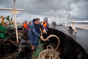 (250708) -- BEIJING, 8 julio, 2025 (Xinhua) -- Imagen del 7 de julio de 2025 de oficiales de policía trabajando con los miembros de la tripulación para asegurar el amarre de un barco en el muelle de Sanjiangkou, en Taizhou, en la provincia de Zhejiang, en el este de China. El Ministerio de Recursos Hídricos de China activó el lunes una respuesta a emergencias de nivel IV a las inundaciones en las provincias orientales de Zhejiang y Fujian a medida que el tifón Danas se aproxima. (Xinhua/Yu Yuexiang) (jg) (ra)