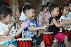 (250708) -- BEIJING, 8 julio, 2025 (Xinhua) -- Imagen del 7 de julio de 2025 de niños aprendiendo a tocar el tambor, en el distrito de Daoxian de la ciudad de Yongzhou, en la provincia de Hunan, en el centro de China. Los niños de todo el país enriquecen sus vacaciones de verano con actividades llenas de color. (Xinhua/He Hongfu) (oa) (ah) (ce)