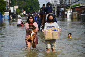 (250708) -- TANGERANG, 8 julio, 2025 (Xinhua) -- Residentes caminan a través del agua de la inundación después de fuertes lluvias, en Tangerang, en la provincia de Banten, Indonesia, el 8 de julio de 2025. (Xinhua/Zulkarnain) (oa) (ah) (vf)