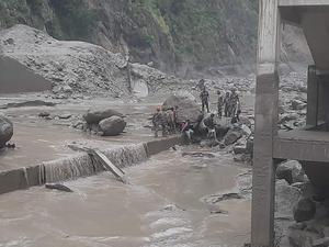 (250708) -- RASUWA, 8 julio, 2025 (Xinhua) -- Rescatistas son vistos en operación tras la desaparición de 18 personas en las inundaciones, en el distrito de Rasuwa, Nepal, el 8 de julio de 2025. Dieciocho personas entre ellas seis ciudadanos chinos, desaparecieron en las inundaciones provocadas por las incesantes lluvias del martes por la mañana en el norte de Nepal. De acuerdo con la Embajada China en Nepal, seis ciudadanos chinos y ocho nepalíes desaparecieron mientras trabajaban juntos en instalaciones con ayuda de China en el puesto fronterizo de Rasuwagadhi. (Xinhua/Ejército de Nepal) (jg) (ra) (ce)