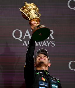 (250707) -- LONDRES, 7 julio, 2025 (Xinhua) -- Imagen del 6 de julio de 2025 del piloto británico de la escudería McLaren, Lando Norris, festejando con su trofeo durante la ceremonia de premiación del Gran Premio de Reino Unido de Fórmula Uno 2025, en el Circuito de Silverstone, en Londres, Reino Unido. (Xinhua/Li Ying) (rtg) (ah) (vf)