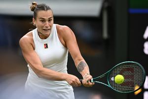 (250707) -- LONDRES, 7 julio, 2025 (Xinhua) -- Imagen del 6 de julio de 2025 de Aryna Sabalenka devolviendo la pelota durante el partido de cuarta ronda de individuales femeninos entre Aryna Sabalenka de Bielorrusia y Elise Mertens de Bélgica en el Campeonato de Tenis de Wimbledon, en Londres, Reino Unido. (Xinhua/Zhao Dingzhe) (oa) (ah) (vf)