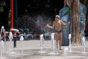 (250708) — BUCAREST, 8 julio, 2025 (Xinhua) — Un niño se refresca en una fuente pública durante un caluroso día de verano, en Bucarest, Rumania, el 8 de julio de 2025. La Administración Meteorológica Nacional de Rumania extendió el lunes las alertas de Código Rojo, Naranja y Amarillo por ola de calor hasta la mañana del miércoles, mientras las temperaturas extremas siguen azotando al país. (Xinhua/Cristian Cristel) (jg) (ra) (vf)