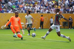 (250709) -- NUEVA JERSEY, 9 julio, 2025 (Xinhua) -- Imagen del 8 de julio de 2025 de Hércules (d), de Fluminense, disparando el balón durante el partido de semifinal entre Fluminense FC, de Brasil, y Chelsea FC, de Inglaterra, en la Copa Mundial de Clubes de la FIFA 2025, en el MetLife Stadium, en Nueva Jersey, Estados Unidos. (Xinhua/Xu Chang) (ah) (ra) (vf)
