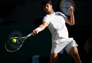 (250709) -- LONDRES, 9 julio, 2025 (Xinhua) -- Imagen del 8 de julio de 2025 de Carlos Alcaraz devolviendo la pelota durante el partido de cuartos de final de individuales masculinos entre Carlos Alcaraz, de España, y Cameron Norrie, de Reino Unido, en el Campeonato de Tenis de Wimbledon, en Londres, Reino Unido. (Xinhua/Li Ying) (ah) (ra) (vf)