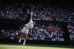 (250710) -- LONDRES, 10 julio, 2025 (Xinhua) -- Imagen del 9 de julio de 2025 de Novak Djokovic sirviendo la pelota durante el partido de cuartos de final de individuales masculinos entre Novak Djokovic, de Serbia, y Flavio Cobolli, de Italia, en el Campeonato de Tenis de Wimbledon, en Londres, Reino Unido. (Xinhua/Zhao Dingzhe) (rtg) (ra) (ce)