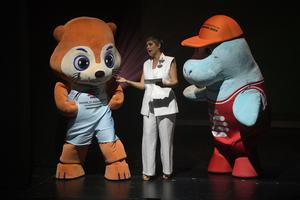 (250710) -- SINGAPUR, 10 julio, 2025 (Xinhua) -- Las mascotas oficiales, la nutria Ollie (i), y el dugongo Dewey (d), realizan una aparición durante la ceremonia de apertura del Campeonato Mundial de Deportes Acuáticos 2025 llevado a cabo en el Singtel Waterfront Theatre, en Singapur, el 10 de julio de 2025. (Xinhua/Then Chih Wey) (rtg) (ra) (vf)