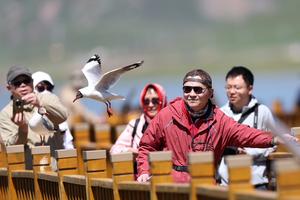 (250712) -- LUQU, 12 julio, 2025 (Xinhua) -- Imagen del 11 de julio de 2025 de turistas observando gaviotas de cabeza marrón en el humedal de Gahai, en el distrito de Luqu de la prefectura autónoma tibetana de Gannan, en la provincia de Gansu, en el noroeste de China. Las aviotas de cabeza marrón en el humedal de Gahai atraen a muchos turistas en verano. (Xinhua/Chen Bin) (rtg) (da)