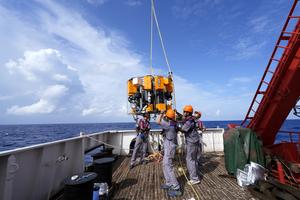 (250711) -- XIANGYANGHONG 10, 11 julio, 2025 (Xinhua) -- Imagen del 8 de julio de 2025 de investigadores elevando un vehículo submarino autónomo en el mar en las aguas septentrionales del Mar Meridional de China. Investigadores chinos han realizado con éxito pruebas científicas con diversos tipos de drones, buques de superficie no tripulados y vehículos submarinos autónomos a bordo del "Xiangyanghong 10" en las aguas septentrionales del Mar Meridional de China en los últimos días. (Xinhua/Zhang Jiansong) (jg) (da) (vf)