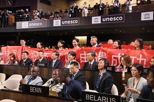 (250711) -- PARIS, 11 julio, 2025 (Xinhua) -- Delegados chinos festejan la inscripción de las Tumbas Imperiales de Xixia de China en la Lista del Patrimonio Mundial durante la 47ª sesión del Comité del Patrimonio Mundial, en París, Francia, el 11 de julio de 2025. La inscripción eleva a 60 el número total de sitios del Patrimonio Mundial en China. (Xinhua/Zhang Baihui) (rtg) (ra) (ce)