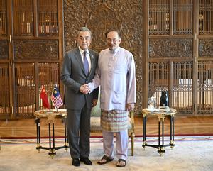 (250711) -- KUALA LUMPUR, 11 julio, 2025 (Xinhua) -- El primer ministro malasio, Anwar Ibrahim, se reúne con el ministro de Relaciones Exteriores chino, Wang Yi, también miembro del Buró Político del Comité Central del Partido Comunista de China, durante la visita de Wang a Malasia con motivo de las reuniones de ministros de Relaciones Exteriores de la ASEAN Plus, en Putrajaya, Malasia, el 11 de julio de 2025. (Xinhua/Cheng Yiheng) (jg) (da) (ce)