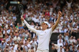 (250714) -- LONDRES, 14 julio, 2025 (Xinhua) -- Imagen del 13 de julio de 2025 de Jannik Sinner festejando su victoria al término de la final de individuales masculinos entre Carlos Alcaraz, de España, y Jannik Sinner, de Italia, en el Campeonato de Tenis de Wimbledon, en Londres, Reino Unido. (Xinhua/Li Ying) (oa) (ah) (vf)