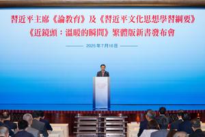 (250716) -- HONG KONG, 16 julio, 2025 (Xinhua) -- John Lee, jefe ejecutivo de la región administrativa especial de Hong Kong, asiste al evento de presentación del libro, en Hong Kong, en el sur de China, el 16 de julio de 2025. Una colección de artículos sobre educación del presidente chino, Xi Jinping, junto con otros dos libros que presentan sus pensamientos e historias, todos en caracteres tradicionales chinos, se estrenaron el miércoles en la apertura de la Feria del Libro de Hong Kong. (Xinhua/Zhu Wei) (jg) (da) (ce)