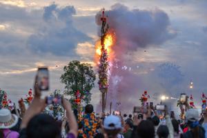 (250720) -- WEISHAN, 20 julio, 2025 (Xinhua) -- Imagen del 19 julio de 2025 de turistas tomando fotografías de la antorcha principal en un festival de la antorcha, en el distrito autónomo yi y hui de Weishan, en la prefectura autónoma bai de Dali, en la provincia de Yunnan, en el suroeste de China. Un festival de la antorcha comenzó aquí el sábado. (Xinhua/Peng Yikai) (oa) (rtg) (ah) (da)