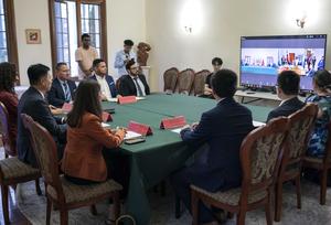 (250720) — TEGUCIGALPA, 20 julio, 2025 (Xinhua) — Imagen del 17 de julio de 2025 del embajador de China en Honduras, Yu Bo (2-i), participando junto a autoridades hondureñas e invitados en un acto virtual para la firma del contrato de adquisición de 3.000 toneladas de camarón hondureño, en la sede de la Embajada de la República Popular China en Honduras, en Tegucigalpa, capital de Honduras. Empresas chinas y hondureñas firmaron esta semana un acuerdo para la exportación de 3.000 toneladas de camarón hondureño al mercado chino, en una muestra del creciente dinamismo económico entre ambos países, tras el establecimiento de relaciones diplomáticas en 2023. (Xinhua/David de la Paz) (dp) (jg) (da)