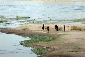 (250725) -- BAGDAD, 25 julio, 2025 (Xinhua) -- Personas juegan a la pelota cerca del río Tigris, en Bagdad, Irak, el 25 de julio de 2025. El Ministerio de Recursos Hídricos de Irak indicó el jueves que la sequía que afecta al país se debe a las pocas precipitaciones y a la reducida afluencia de agua desde los países aguas arriba, y advirtió de una severa inseguridad hídrica en todo el país. (Xinhua/Khalil Dawood) (jg) (da)