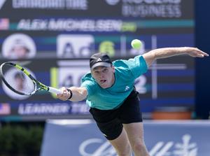 (250803) -- TORONTO, 3 agosto, 2025 (Xinhua) -- Imagen del 2 de agosto de 2025 de Alex Michelsen, de Estados Unidos, devolviendo la pelota durante el partido de octavos de final de individuales masculinos entre Alex Michelsen, de Estados Unidos, y Learner Tien, de Estados Unidos, en el torneo de tenis Abierto National Bank 2025, en Toronto, Canadá. (Xinhua/Zou Zheng) (rtg) (da)
