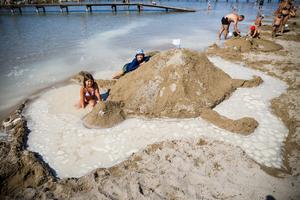 (250824) -- NIN, 24 agosto, 2025 (Xinhua) -- Imagen del 23 de agosto de 2025 de niños posando para una fotografía con una tortuga de arena durante el Festival de Arena en una playa, en Nin, Croacia. (Xinhua/Emica Elvedji/PIXSELL) (oa) (ah)